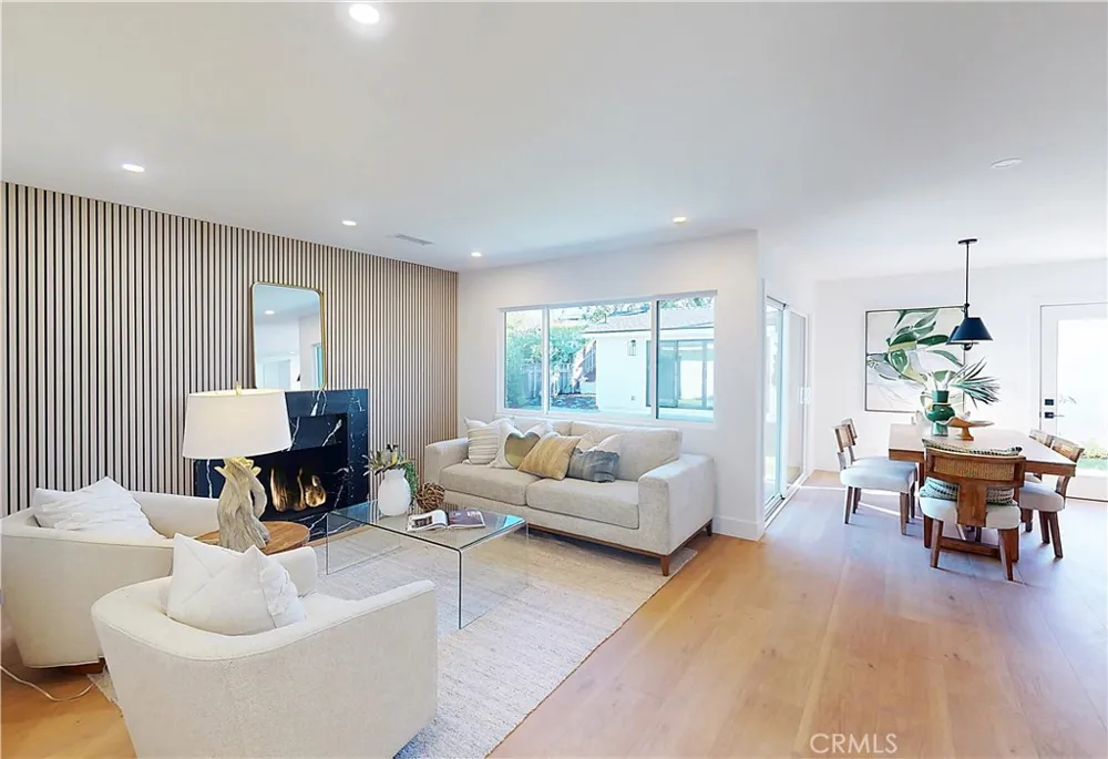 Thoughtfully reimagined with a refined contemporary sensibility, this beautifully remodeled residence offers an exceptional blend of modern design, everyday functionality, and long-term flexibility, set on a prominent corner lot in Rancho Palos Verdes. The single-level main home features four well-appointed bedrooms and two full bathrooms, designed to support both growing families and those seeking effortless, stair-free living. A light-filled open floor plan creates a natural flow between spaces, anchored by a striking marble fireplace framed by a custom slatted feature wall—an architectural focal point that adds warmth and sophistication to the living area. Wide-plank white oak flooring runs throughout, complementing the home’s clean lines and cohesive palette. The dining area overlooks the enclosed backyard, offering a seamless connection between indoor and outdoor living; ideal for both daily life and entertaining. At the heart of the home, the kitchen reflects a no-expense-spared approach, combining form and function with elevated style. A striking split-tone design pairs a wall of crisp white cabinetry with a white oak island, topped in dramatic black marble countertops. High-end appliances, including an undercounter microwave drawer, complete a space designed for both beauty and performance. The primary suite serves as a private retreat, featuring a bold black-and-white palette, contemporary lighting and fixtures, and a spa-inspired bathroom with a freestanding soaking tub—a serene space to unwind at the end of the day. Throughout the home, modern black hardware, lighting, and plumbing fixtures provide a cohesive and polished aesthetic. Enhancing the home’s versatility is a detached bonus living space, complete with a bathroom — ideal as a private home office, guest suite, flex space, or additional bedroom. This rare feature offers exceptional adaptability for today’s evolving lifestyles, from remote work to multigenerational living. Additional highlights include a two-car garage, modern low-maintenance landscaping, an enclosed backyard, and excellent curb appeal that reflects the quality and intention found throughout the home. Designed for how people live today—and how they will live tomorrow—this turnkey property offers a rare combination of architectural style, thoughtful layout, and flexible living in one of Rancho Palos Verdes’ most desirable settings.